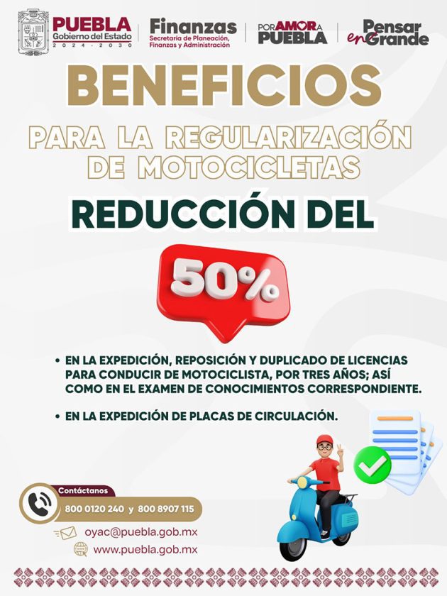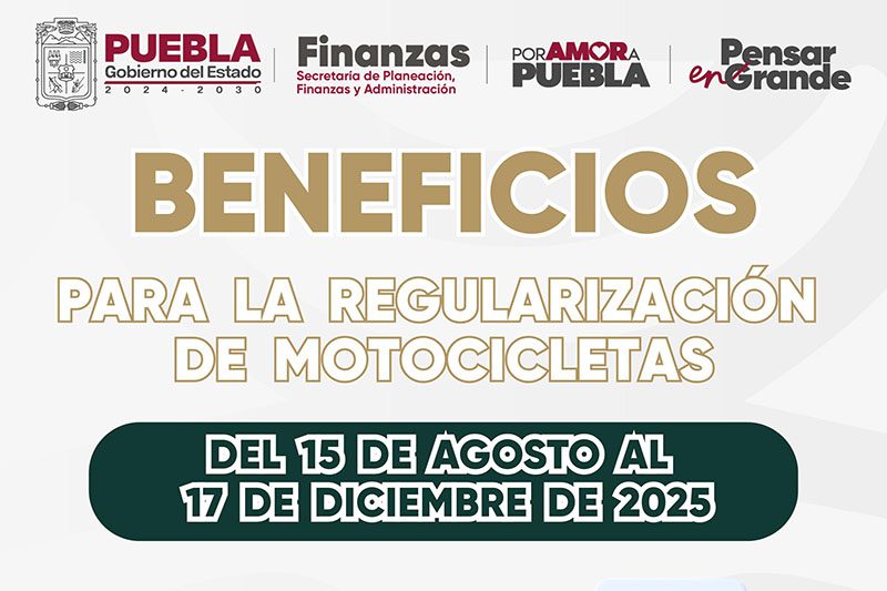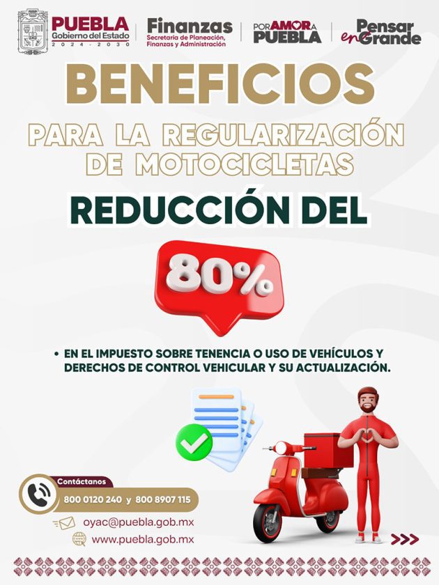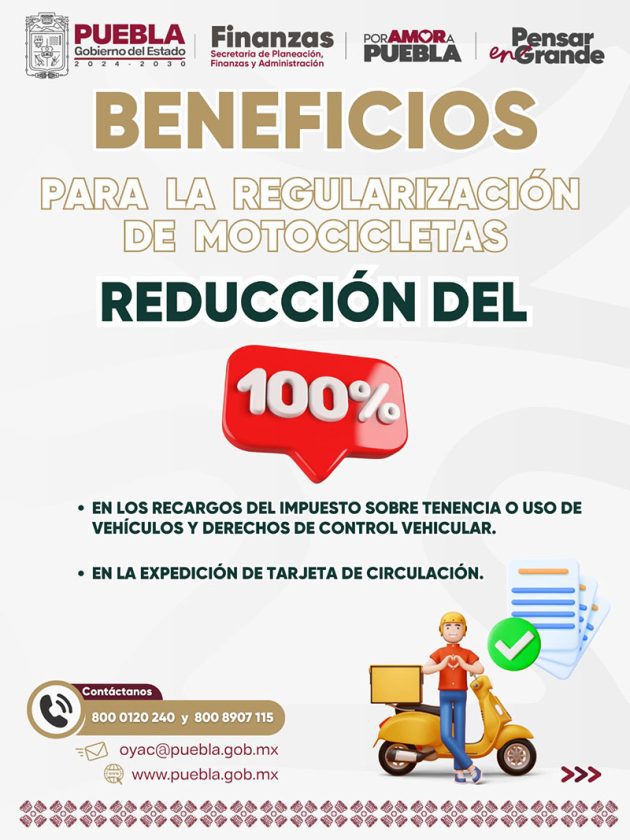 Con la finalidad de que las propietarias y los propietarios de motocicletas puedan cumplir con las disposiciones fiscales, el Gobierno del Estado de Puebla, a través de la Secretaría de Planeación Finanzas y Administración, ha implementado diversas acciones para la regularización de estas unidades, que consisten en la reducción parcial del pago de las siguientes contribuciones: