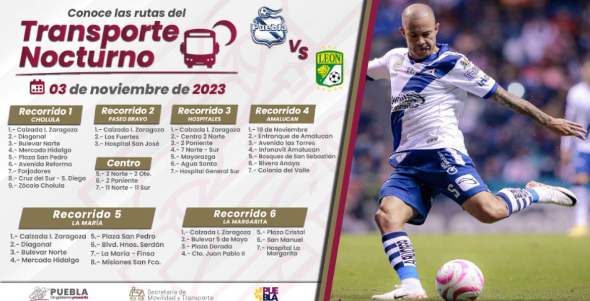El gobierno presente de Sergio Salomón, a través de la Secretaría de Movilidad y Transporte (SMT), habilitará el servicio de transporte nocturno al término del encuentro Puebla contra León en el Estadio Cuauhtémoc, en un horario de 23:00 a 00:30 horas, con la finalidad de que las y los asistentes puedan regresar a sus hogares de manera segura.