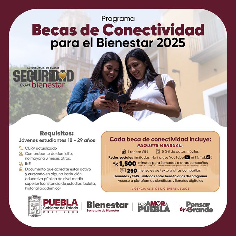 Lo que se ama, se cuida con mayores oportunidades de educación, salud, empleo y bienestar, por eso, el Gobierno del Estado de Puebla, a través de la Secretaría de Bienestar comenzó el registró del Programa de Becas de Conectividad 2025 “Por Amor a Puebla, dirigido a estudiantes entre 15 a 29 años, de escuelas públicas en la entidad.