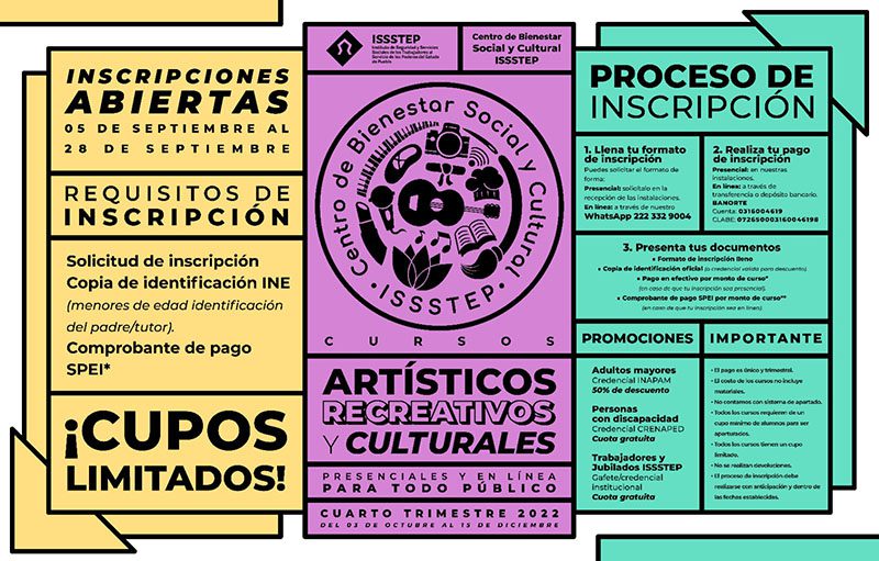 El Centro de Bienestar Social y Cultural del Instituto de Seguridad y Servicios Sociales de los Trabajadores al Servicio de los Poderes del Estado de Puebla (ISSSTEP), invita a la población en general a inscribirse a los cursos artísticos, recreativos y culturales que va a desarrollar del 03 de octubre al 15 de diciembre de manera presencial y en línea.