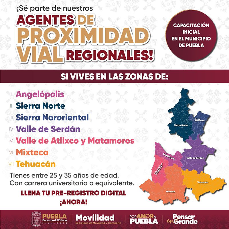 El gobierno humanista encabezado por el mandatario Alejandro Armenta, a través de la Secretaría de Movilidad y Transporte (SMT), convoca a las y los interesados de las regiones de la Sierra Norte, Sierra Nororiental, Valle de Serdán, Angelópolis, Valle de Atlixco y Matamoros, Mixteca y Tehuacán a integrarse como Agentes de Proximidad Vial al interior del estado.