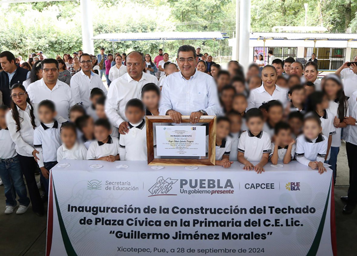 Con el objetivo de mejorar las aulas educativas de los 33 centros escolares del estado, el gobierno presente de Sergio Salomón favorece las condiciones en materia de infraestructura para las y los alumnos, docentes y directivos, informó el titular de la Secretaría de Educación, Jorge Estefan Chidiac en el Centro Escolar “Licenciado Guillermo Jiménez Morales”, en donde el mandatario entregó el techado de la plaza cívica de la primaria.