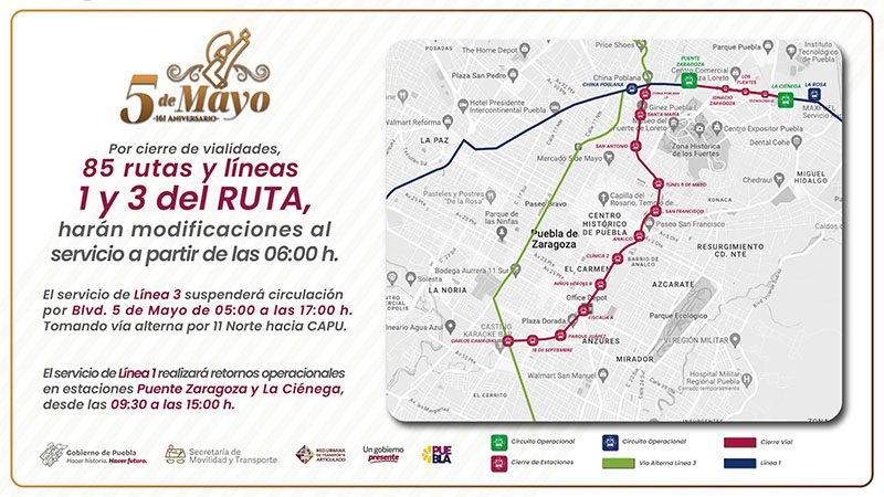 El gobierno presente de Sergio Salomón, a través de la Secretaría de Movilidad y Transporte (SMT), informa que 85 rutas del transporte público y las líneas 1 y 3 de la Red Urbana de Transporte Articulado (RUTA) modificarán recorridos este viernes 5 de mayo por la realización del Desfile Cívico-Militar de la Batalla de Puebla.