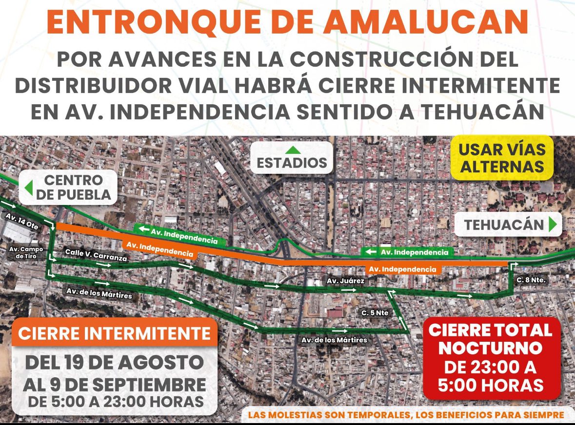 La Secretaría de Infraestructura informa que por los avances en la construcción del Distribuidor Vial “Ejército de Oriente”, habrá cierres intermitentes en Avenida Independencia, sentido a Tehuacán, del 19 de agosto al 09 de septiembre. Esta medida se contempla para la seguridad de trabajadores, los usuarios y prestadores de servicios, ya que habrá excavaciones, cimentación y colado de columnas; además, la Comisión Federal de Electricidad (CFE) estará realizando trabajos.
