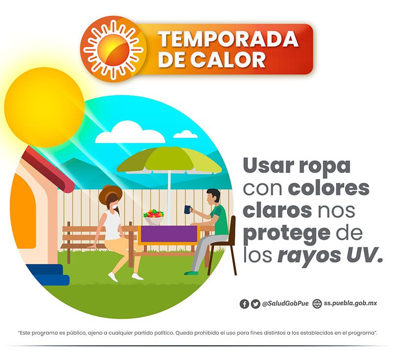La Secretaría de Salud informa sobre las posibles enfermedades que puedan adquirir las y los poblanos debido a las temperaturas altas que se presentan como: diarreicas agudas, golpes de calor, deshidratación y quemaduras solares, por lo que emite las siguientes recomendaciones para prevenirlas.