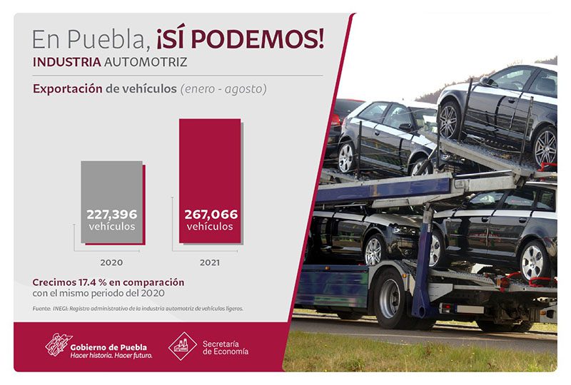 En tanto, las exportaciones de vehículos ligeros desde Puebla ubicaron a la entidad en segundo lugar nacional al sumar 267 mil 66 unidades entre enero y agosto, un crecimiento del 17.44 por ciento con respecto al mismo periodo del 2020, cuando se enviaron a mercados del exterior 227 mil 396 automotores.