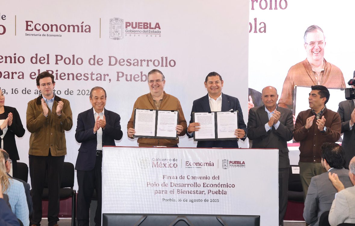 El secretario de Economía del Gobierno de México, Marcelo Ebrard y el gobernador de Puebla, Alejandro Armenta, encabezaron la firma de Convenio del Polo de Desarrollo Económico para el Bienestar «Capital de la Tecnología y la Sostenibilidad», a través del cual se incentivará la inversión y se protegerá a empresarios locales y nacionales, como lo establece la política del gobierno de la presidenta Claudia Sheinbaum.