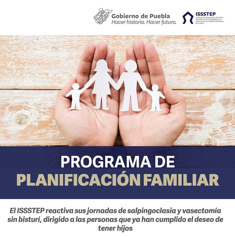 El Instituto de Seguridad y Servicios Sociales de los Trabajadores al Servicio de los Poderes del Estado de Puebla (ISSSTEP), informa que ya se encuentra activo el Programa de Planificación Familiar para mujeres y hombres que han cumplido el deseo de tener hijos y buscan un método definitivo, mediante salpingoclasia y vasectomía sin bisturí.