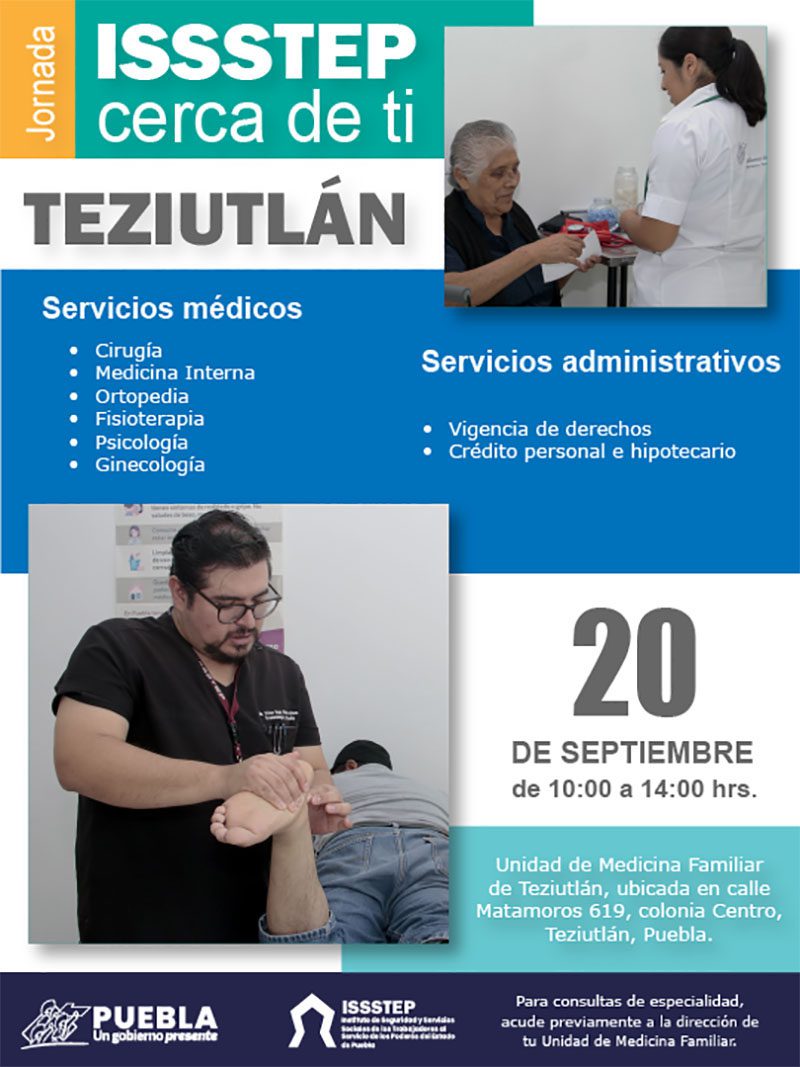 Como parte de las acciones que desarrolla el gobierno presente de Sergio Salomón para fortalecer el bienestar de la población, el Instituto de Seguridad y Servicios Sociales de los Trabajadores al Servicio de los Poderes del Estado de Puebla invita a la jornada regional “ISSSTEP cerca de ti” en Teziutlán, este viernes 20 de septiembre de 10:00 a 14:00 horas.