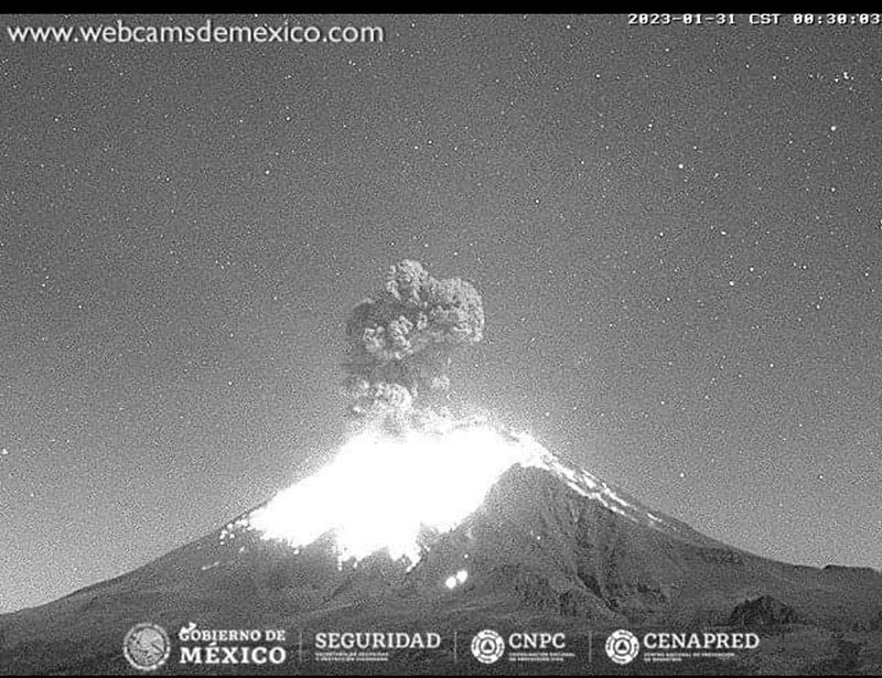 La madrugada de este martes 31 de enero, a las 00:29 y 06:18 horas, el volcán Popocatépetl registró dos explosiones moderadas con expulsión de material incandescente, emisiones de vapor de agua, gases y ceniza que el viento dispersó hacia el noroeste, Estado de México y Morelos, informó la Coordinación General de Protección Civil.