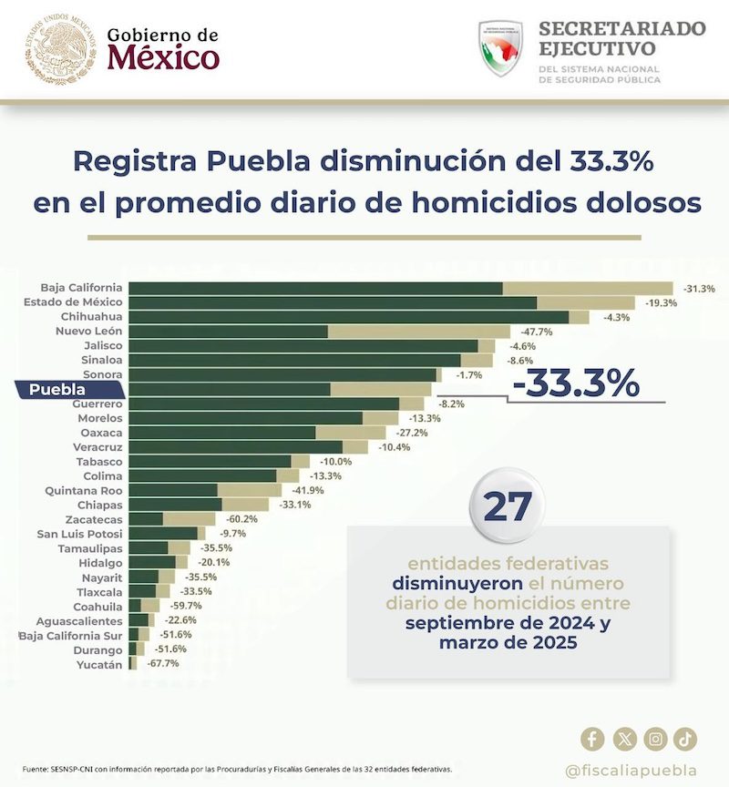 El estado de Puebla tuvo una disminución del 33.3% en el promedio diario de homicidios dolosos durante el periodo comprendido entre septiembre de 2024 y marzo de 2025, de acuerdo con lo informado este día por Marcela Figueroa Franco, titular del Secretariado Ejecutivo del Sistema Nacional de Seguridad Pública (SESNSP).