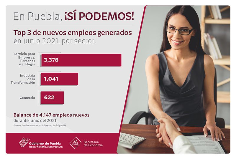El estado de Puebla sumó alrededor de 6.29 por ciento de los empleos con seguridad social generados en el país durante junio del 2021, el mejor registro para un mes en la entidad durante el presente año, informa la Secretaría de Economía.