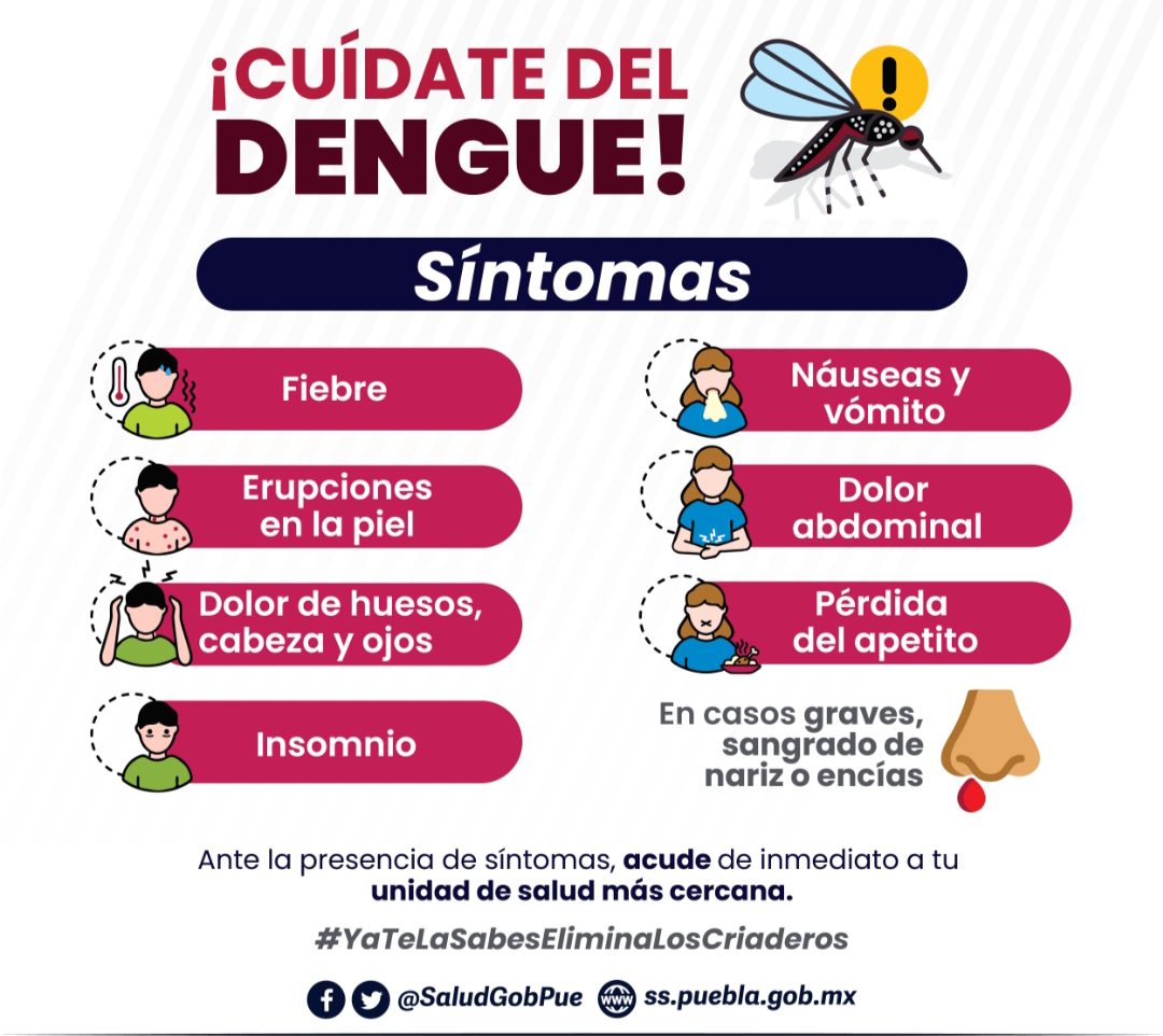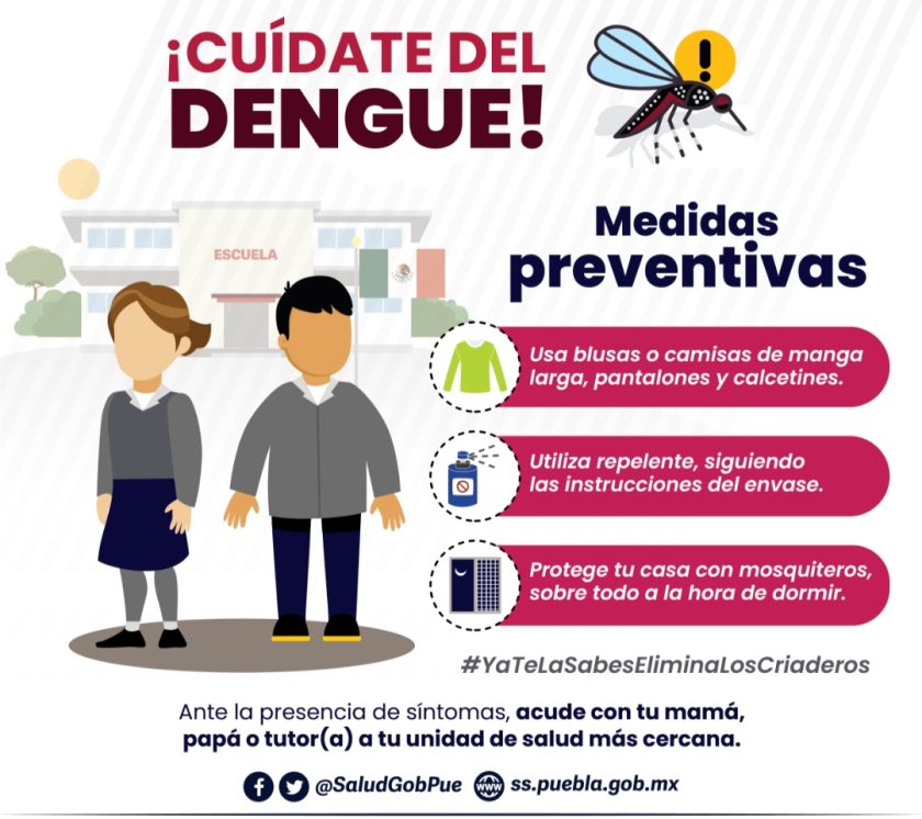 Por ello, Soria Córdoba reiteró la invitación a las y los poblanos de zonas endémicas a que sigan las recomendaciones de las autoridades sanitarias, como mantener sus patios y azoteas limpios y libres de recipientes que se conviertan en criaderos de moscos y usar prendas de manga larga para evitar picaduras; así como acudir a su unidad médica más cercana en caso de síntomas como fiebre, náusea o sarpullido.