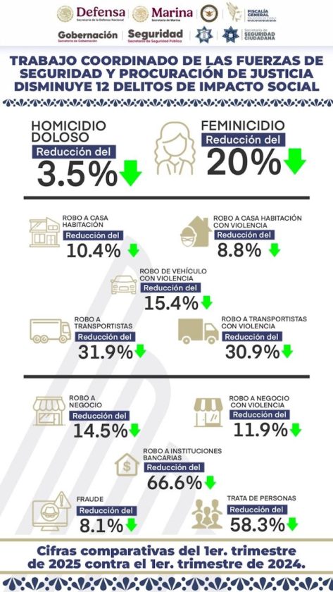 Como parte de la estrategia de seguridad que ha marcado la presidenta de la República, Claudia Sheinbaum Pardo, y resultado de la coordinación interinstitucional entre las Secretarías de la Defensa Nacional (SEDENA), de Marina (SEMAR), Guardia Nacional (GN), la Secretaría de Seguridad Pública del Estado, la Fiscalía General del Estado y autoridades municipales, la incidencia delictiva tuvo una disminución en 12 delitos de impacto social en el estado de Puebla, tratándose del homicidio doloso, el feminicidio, los robos a casa habitación, de vehículo con violencia, a transportistas, a negocios, a instituciones bancarias, así como el fraude y la trata de personas.