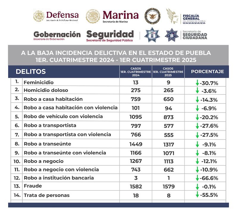 Pastor Betancourt precisó que esta información está basada en las estadísticas de la Fiscalía General del Estado, registradas en el primer cuatrimestre de 2025, en relación con el primer cuatrimestre de 2024, tratándose del feminicidio, homicidio doloso, robo a casa habitación, de vehículo con violencia, a transportistas, a transeúntes, a negocios, a instituciones bancarias, fraude y trata de personas, entre otros.