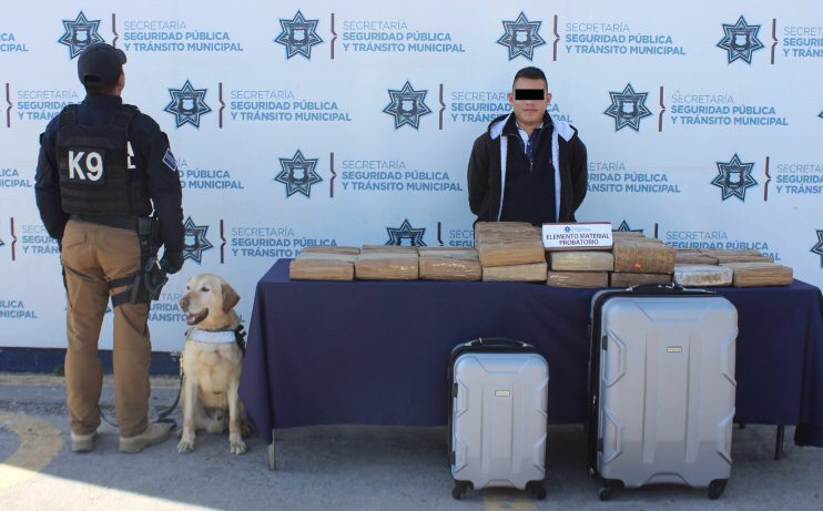 Policías Municipales adscritos al Grupo K9, realizaban labores de vigilancia en pasillos de la citada central camionera, cuando de repente se percataron que un ejemplar canino especializado en la detección de narcóticos modificó su comportamiento frente a dos maletas, propiedad de un joven.
