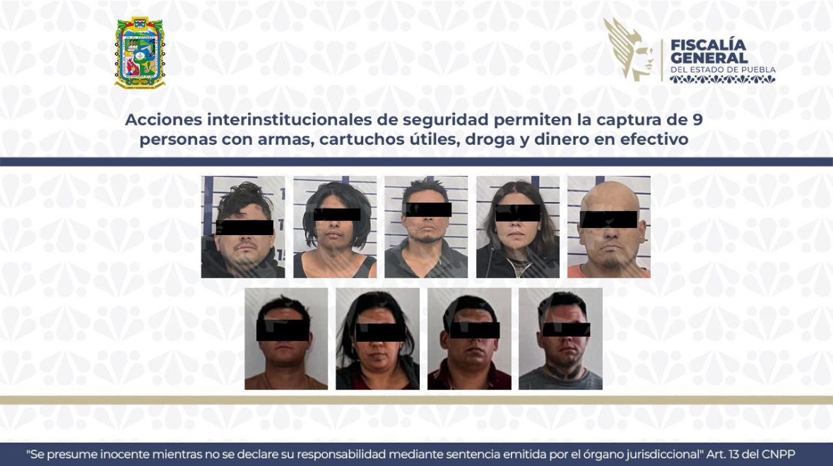 Como resultado de un operativo interinstitucional a cargo de la Fiscalía General del Estado de Puebla, en coordinación con la Secretaría de Seguridad Pública del Estado, se logró la detención de nueve personas en posesión de armas de fuego, cartuchos útiles, droga y dinero en efectivo.