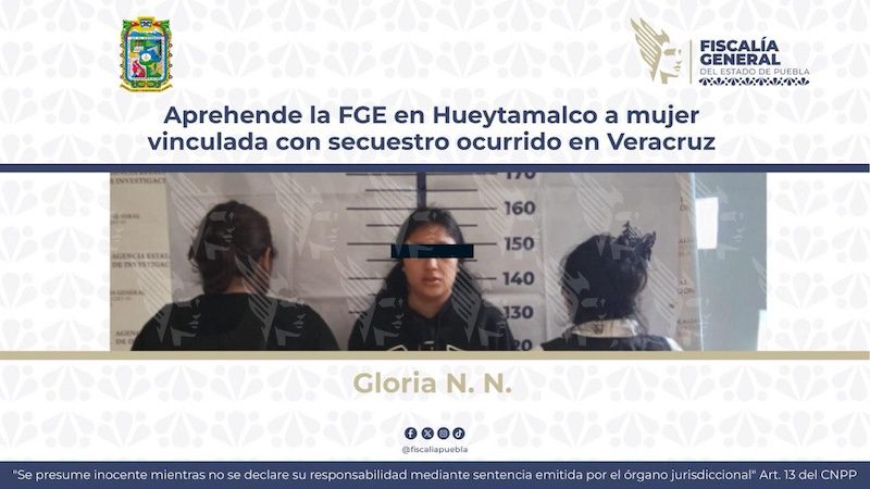 La Fiscalía General del Estado de Puebla cumplimentó una orden de aprehensión en contra de Gloria N. N., de 18 años de edad, acusada del delito de secuestro agravado, ocurrido en el estado de Veracruz.