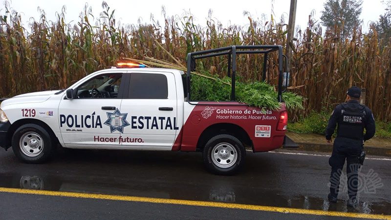 Agentes de la Policía Estatal localizaron y aseguraron plantas de hierba con apariencia de la marihuana en un terreno baldío en Chignautla.