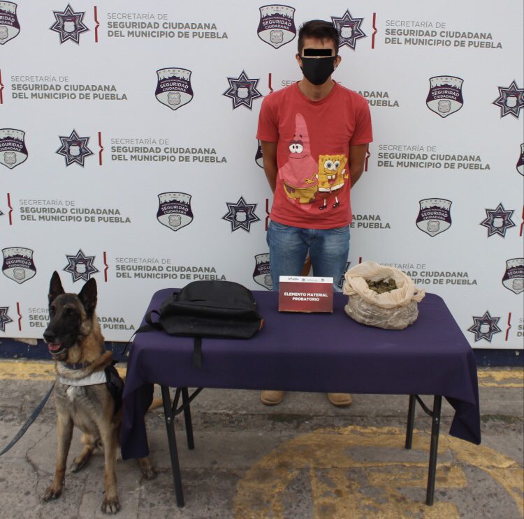 Asegura unidad canina de la SSC de Puebla más de un kilogramo de marihuana; hay un detenido