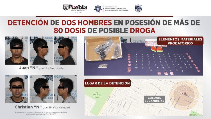 Como resultado de la implementación de acciones policiales para inhibir la venta y/o distribución de posible droga en la ciudad, la Secretaría de Seguridad Ciudadana (SSC) del Municipio de Puebla detuvo en la colonia Bugambilias a Christian “N.”, de 28 años de edad y Juan “N.”, de 19 años de edad, por su probable participación en hechos con apariencia de delitos contra la salud y portación de arma de fuego sin la licencia correspondiente.