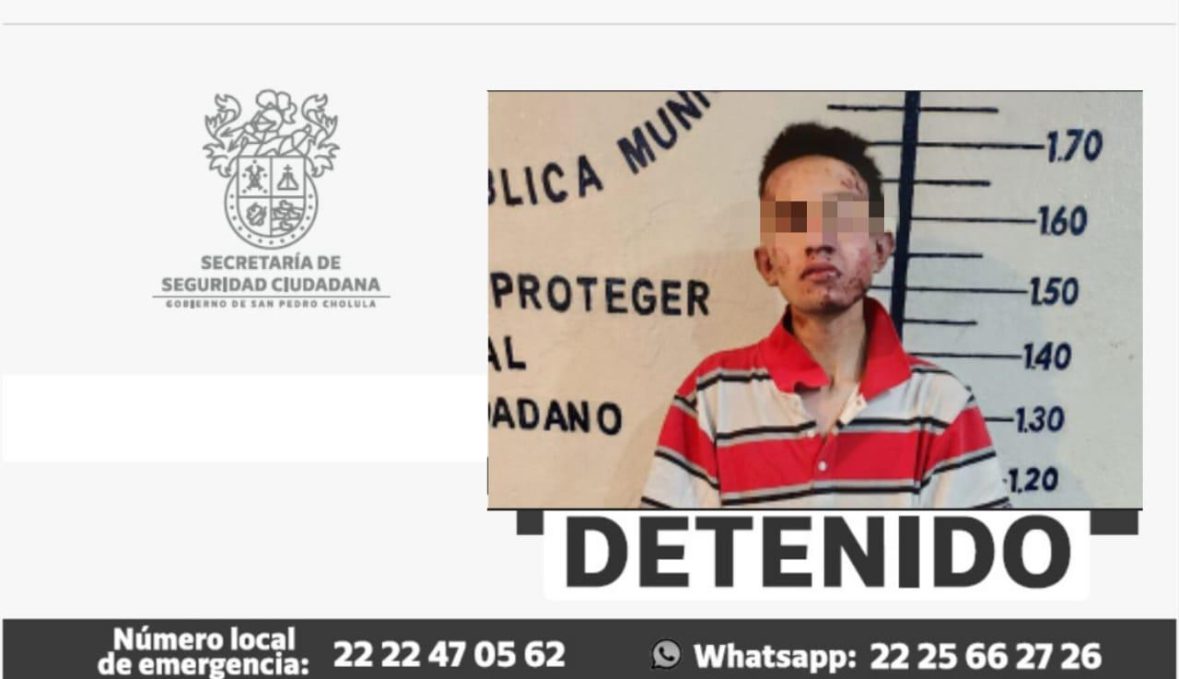 En acción coordinada con la Secretaría de Seguridad Pública del Estado (SSP) y Guardia Nacional (GN), elementos de la Secretaría de Seguridad Ciudadana de San Pedro Cholula (SSC Cholula), detuvieron a José Manuel “N” de 22 años de edad, por su presunta participación en el delito de tentativa de robo, al interior de la iglesia de la Junta Auxiliar de San Juan Tlautla.