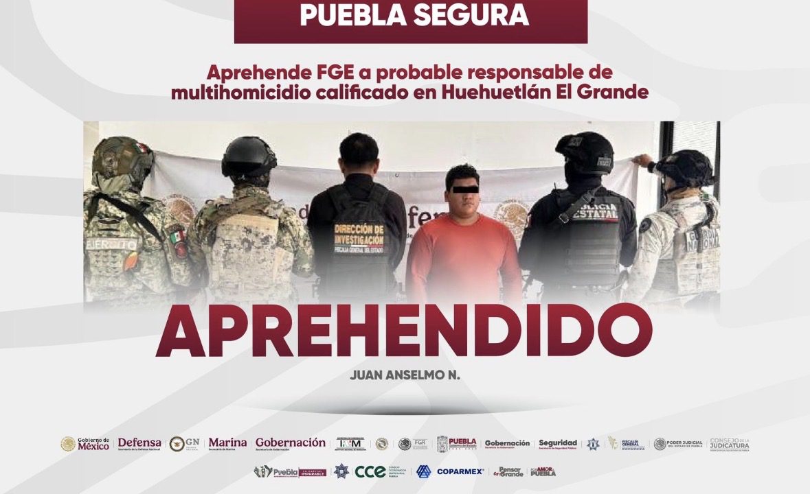 El detenido, de 30 años de edad, está relacionado directamente con el homicidio calificado de seis personas, localizadas el pasado 24 de febrero en el municipio de Huehuetlán El Grande.
