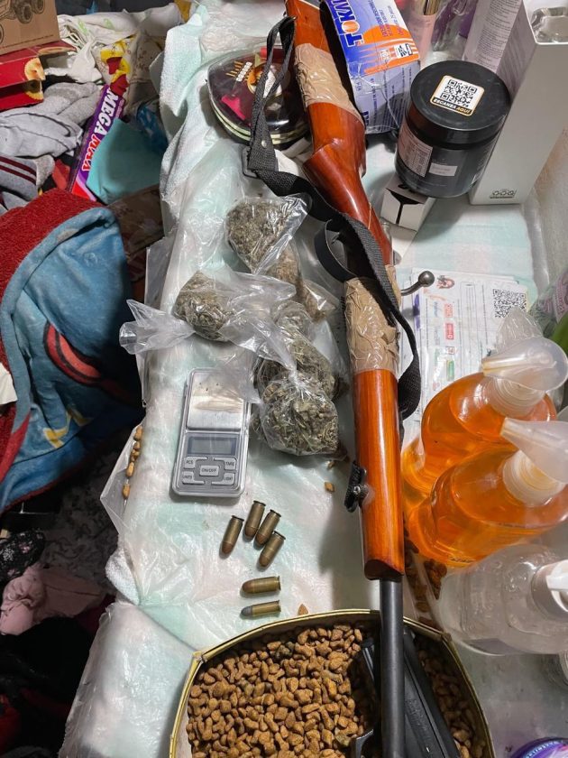 En la diligencia fue detenido Daniel N., junto con los siguientes indicios: 15 cartuchos útiles de diferentes calibres, 1 rifle, 6 bolsas de plástico que en su interior contienen hierba de color verde y seca con características similares al narcótico conocido como marihuana, y una báscula, digital, tipo gramera.