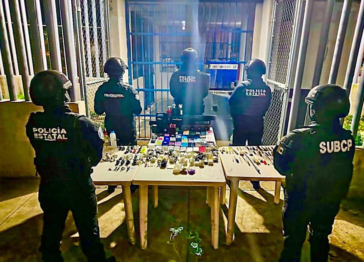 Asimismo, se aseguraron envoltorios con posible droga, ocho básculas, 30 pipas, 24 instrumentos punzocortantes y un martillo hechizo.