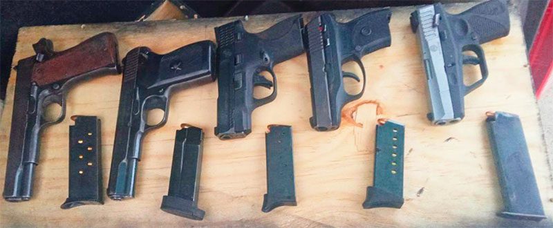 Durante la revisión preventiva, fueron detenidos José N., Mario N, Daniel N., y Jenifer N., en posesión de cinco armas de fuego tipo escuadra y cinco cartuchos útiles.