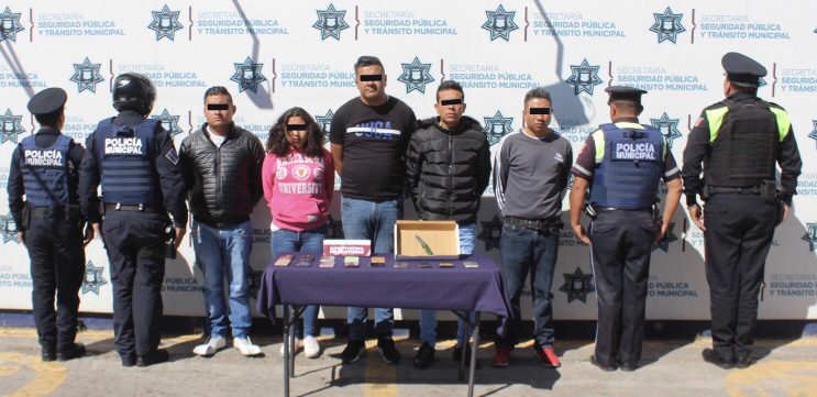 Derivado de la suma de esfuerzos y mediante la implementación de estrategias táctico – operativas, Policías Municipales lograron la detención de cuatro hombres y una mujer, quienes fueron plenamente identificados por una víctima. Además, esta intervención permitió la recuperación de un teléfono celular, propiedad de la parte agraviada; también, se aseguró un objeto punzocortante y más de una decena de dispositivos de comunicación móvil, presuntamente robados.