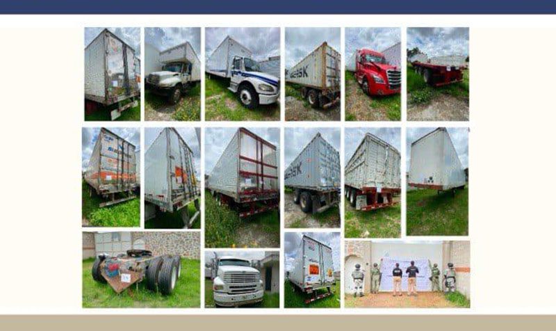 Durante la ejecución de la diligencia, se aseguró el vehículo reportado como robado, así como tres tractocamiones, 10 semirremolques y un dolly, todos con reporte de robo, mismos que quedaron a disposición del agente del Ministerio Público junto con el inmueble, a fin de continuar con las investigaciones pertinentes.