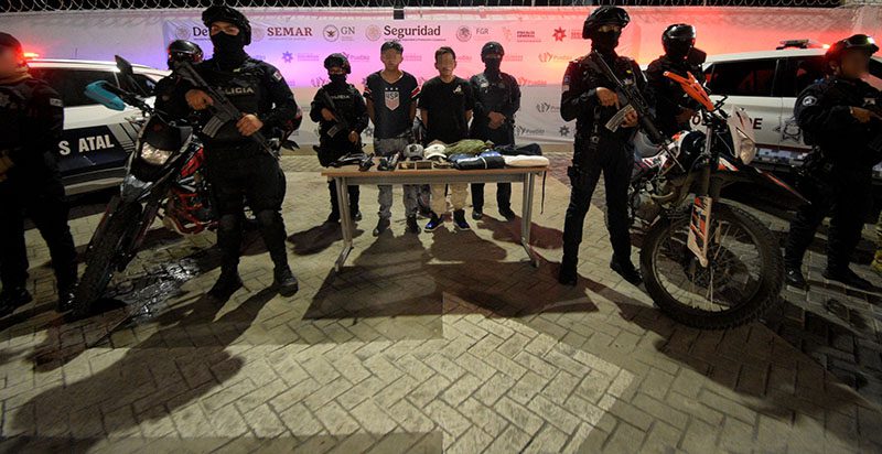 Mediante un despliegue territorial implementado en calles del primer cuadro de la ciudad, los elementos detuvieron a José “N.”, de 35 años de edad, quien cuenta con registro por delitos contra la salud, portación de arma de fuego y objeto prohibido, robo a transporte público y a transeúnte; y a Alejandro “N.”, de 18 años de edad.