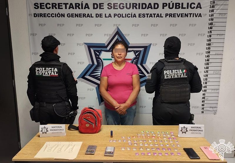 Durante labores de vigilancia en la colonia Solidaridad Nacional, los uniformados ubicaron a la mujer, quien estaba en posesión de 68 dosis de aparente cristal, dos básculas grameras, seis pipas para el consumo de sustancias ilícitas y un cartucho para escopeta calibre .16 milímetros.