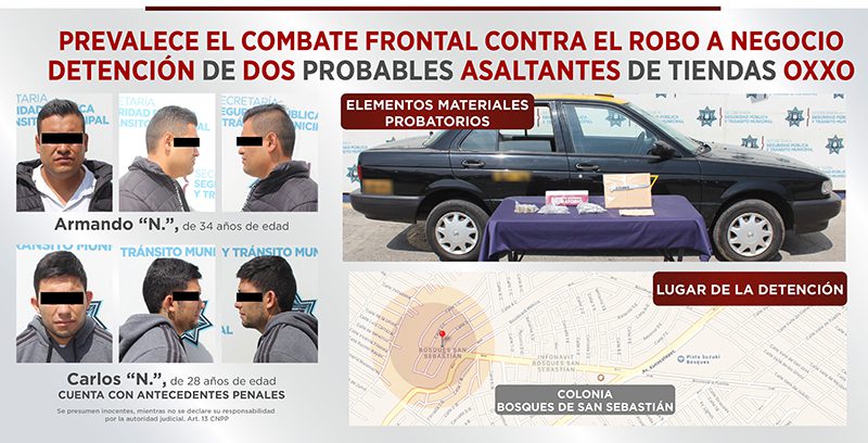 En seguimiento puntual a la implementación de estrategias para inhibir la comisión de conductas delictivas, la Secretaría de Seguridad Ciudadana (SSC) del Municipio de Puebla detuvo en la colonia Bosques de San Sebastián a Armando “N.”, de 34 años de edad y Carlos “N.”, de 28 años de edad, por su probable participación en hechos con apariencia de delito de robo a negocio.