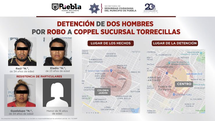 Mediante la implementación de esquemas de búsqueda ininterrumpida, la Secretaría de Seguridad Ciudadana (SSC) del Municipio de Puebla logró la detención de Raúl “N.”, de 34 años de edad; y Eladio “N.”, de 23 años de edad, por su probable participación en hechos con apariencia de delito de robo a negocio.