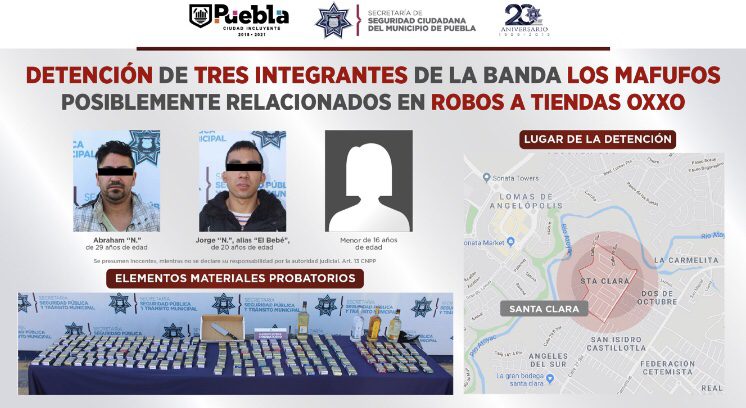 Con base en labores de inteligencia policial, generación de redes de vínculos delictivos y labores en campo, se presume que Abraham “N.”, Jorge “N.” y la joven menor de edad, formarían parte del grupo organizado para delinquir identificado como “Los Mafufos”, presuntamente relacionado en diversos robos a tiendas de conveniencia. Además, se estableció que estas personas operaban en colonias como Santa Isabel Castillotla, Jardines de San Manuel, San José Xilotzingo así como, en San Andrés Cholula.