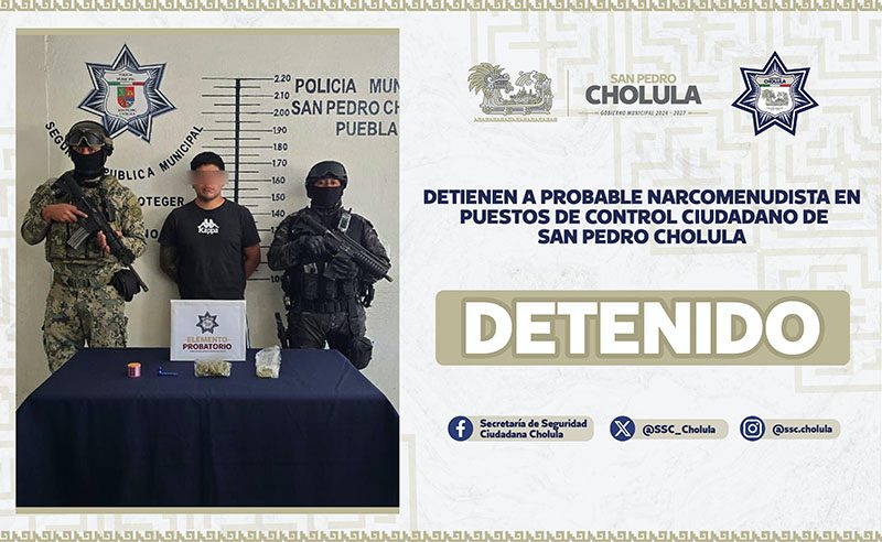 Como resultado de estrategias de seguridad, elementos del Grupo Táctico de la Secretaría de Seguridad Ciudadana de San Pedro Cholula (SSC Cholula) y elementos de la Secretaría de Marina, detuvieron a Luis Ángel “N” de 26 años de edad, por probables delitos contra la salud.