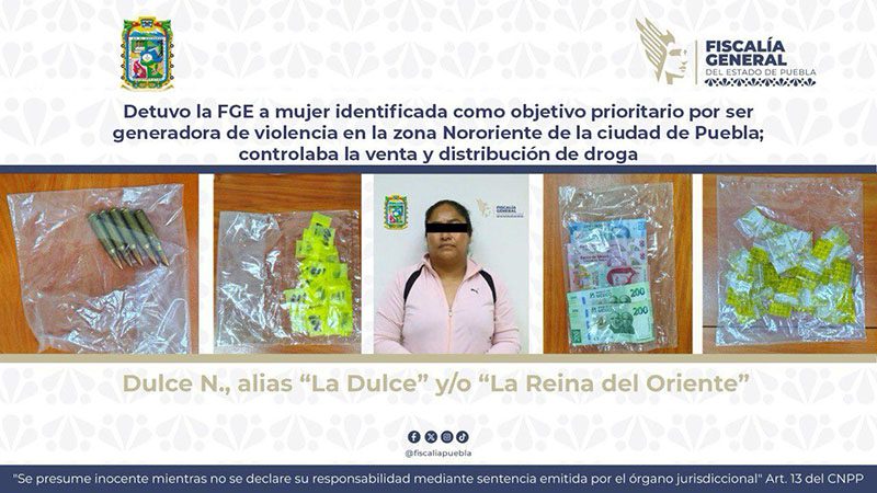 A través de una operación estratégica, la Fiscalía General del Estado logró la detención de Dulce N., alias “La Dulce” y/o “La Reina del Oriente”, considerada como objetivo prioritario para la institución por su presunta participación en actividades delictivas como venta y distribución de droga, secuestros, privaciones ilegales de la libertad y homicidios, entre otros, que generaban violencia en la zona Nororiente de la ciudad de Puebla.