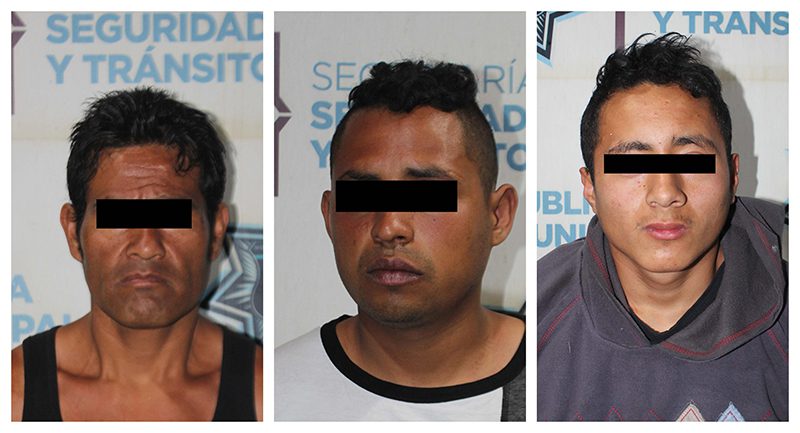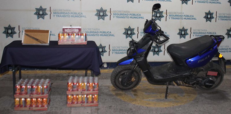 En una primera acción, Policías Municipales adscritos a la Región Norte, Zona Tres, detuvieron en la calle Tejocotes, de la colonia Rosales, a Alberto “N.” y Jonathan “N.”, de 39 y 24 años de edad, respectivamente, quienes fueron señalados por un empleado de una empresa cervecera como responsables de desapoderarlo de mercancía diversa.