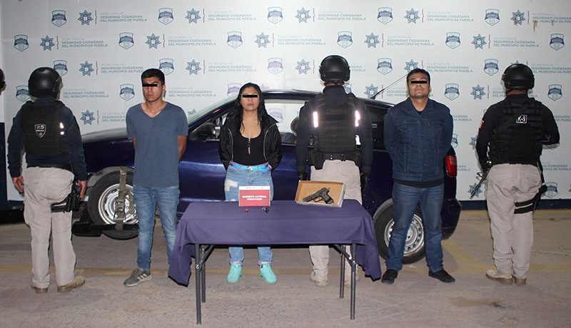 Como resultado del fortalecimiento de esquemas preventivos en la Unidad Habitacional La Margarita, la Secretaría de Seguridad Ciudadana (SSC) del Municipio de Puebla detuvo a Edson “N.”, de 33 años de edad, Alexa “N.” y Uriel “N.”, ambos de 21 años de edad, por su probable participación en hechos con apariencia de delito de portación de arma de fuego sin la licencia correspondiente.