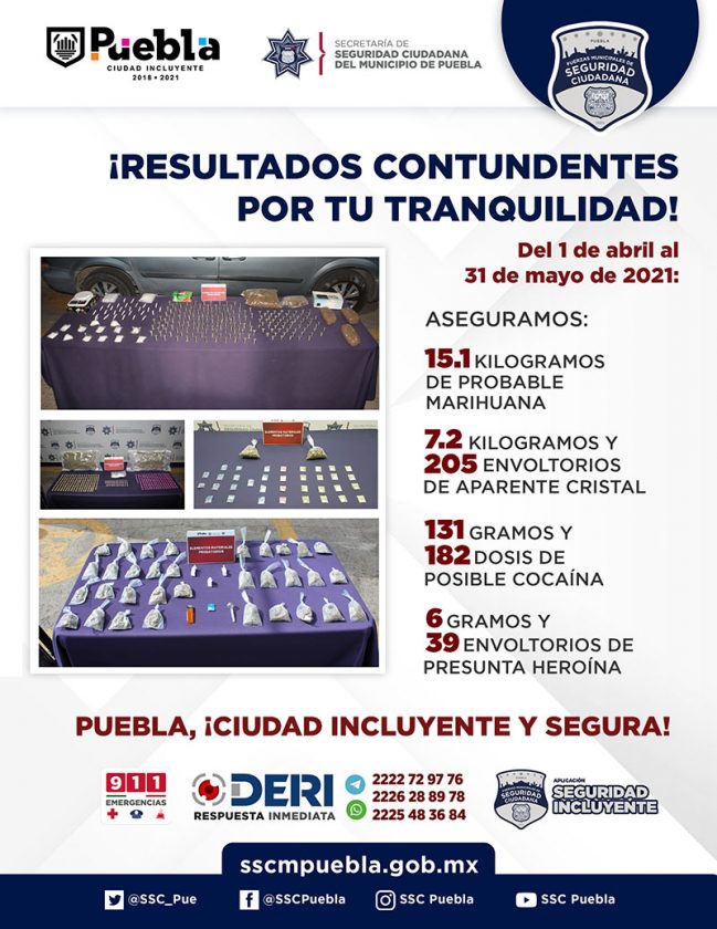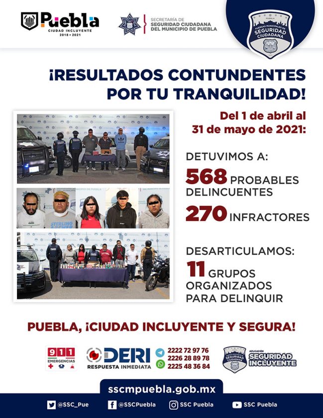 Derivado del fortalecimiento de acciones encaminadas al combate frontal contra la delincuencia, durante abril y mayo de este año, la Secretaría de Seguridad Ciudadana (SSC) del Municipio de Puebla reportó la detención de cerca de 900 personas y la desintegración de más de 10 grupos organizados para delinquir, entre otros resultados.