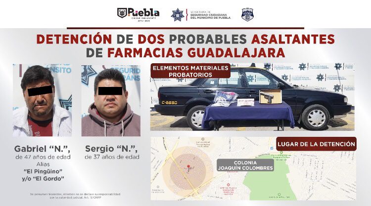 Mediante labores de inteligencia y operatividad policial, la Secretaría de Seguridad Ciudadana (SSC) del Municipio de Puebla detuvo a Gabriel “N.”, alias “El Pingüino” y/o “El Gordo”, de 47 años de edad así como, a Sergio “N.”, de 37 años de edad, por su probable participación en hechos con apariencia de delito de robo a negocio.