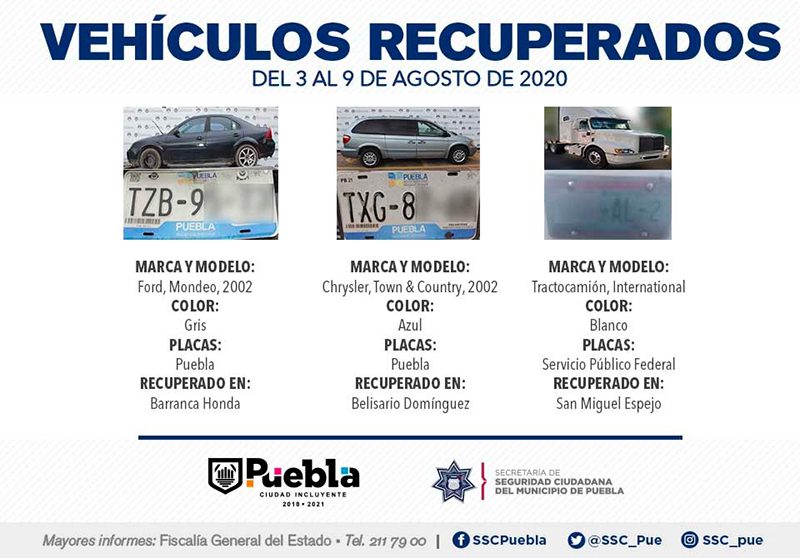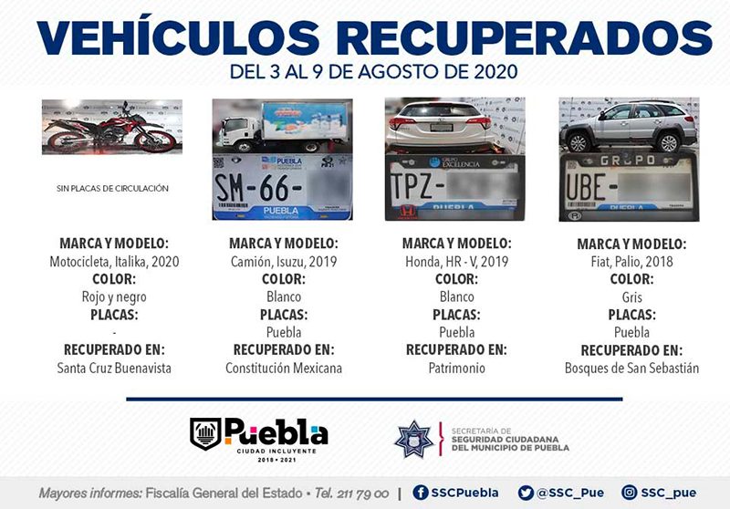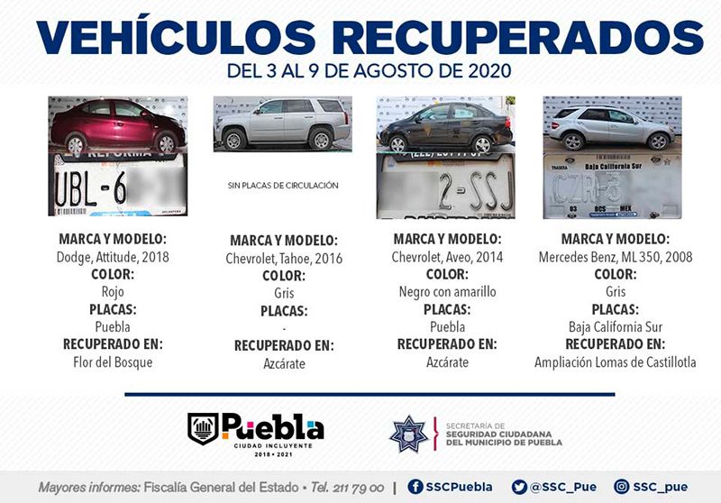 Como resultado de la constante implementación de medidas de vigilancia en los 271 Vectores de Proximidad, la Secretaría de Seguridad Ciudadana (SSC) del Municipio de Puebla reportó la recuperación de 12 vehículos con reporte de robo, en el periodo comprendido del 3 al 9 de agosto del presente año