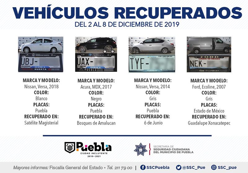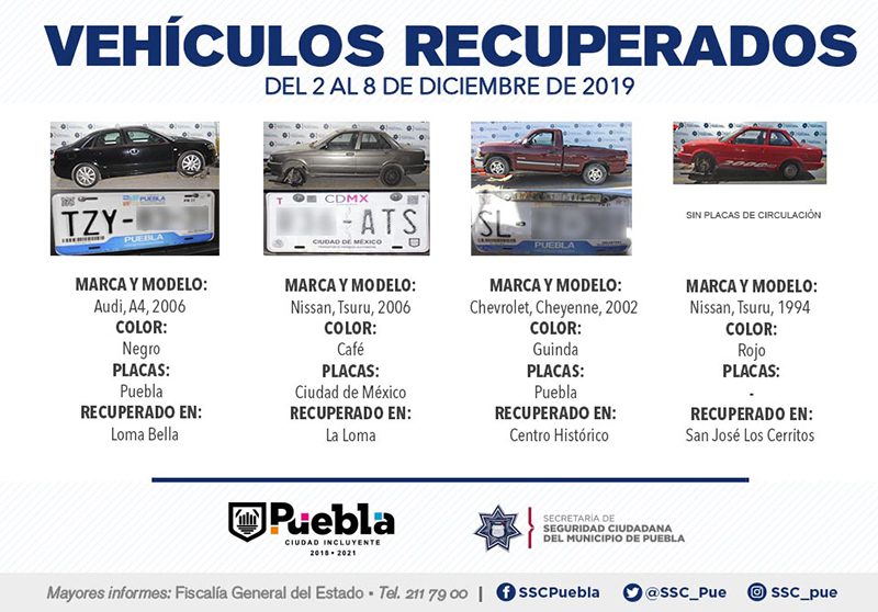 Derivado de la implementación de esquemas de vigilancia en colonias, unidades habitaciones, barrios y 17 juntas auxiliares que conforman la capital, la Secretaría de Seguridad Ciudadana (SSC) del municipio de Puebla informó que, del 2 al 8 de diciembre del presente año, remitió ante el Agente del Ministerio Público 11 vehículos por diversos motivos.