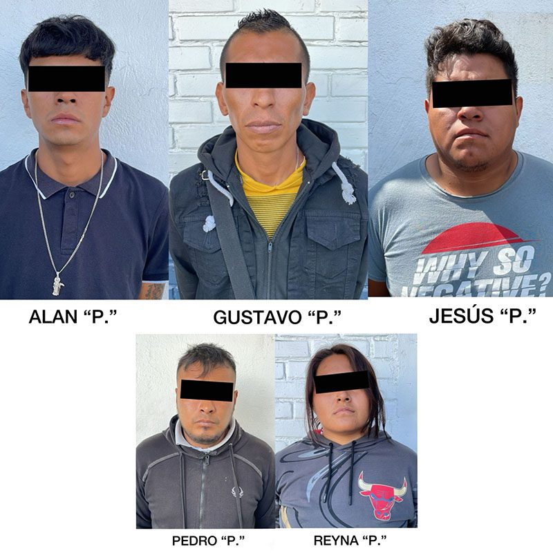 Esta mañana, en la 31 Poniente y 13 Sur, en la zona de la Facultad de Medicina de la BUAP, elementos de la Secretaría de Seguridad Ciudadana detuvieron a Gustavo “P.”, de 36 años, Pedro “P.”, de 29 años, Jesús “P.”, de 27 años, Reyna “P.”, de 26 años y Alan “P.”, de 21 años, por el robo de pertenencias a ciudadanos que viajaban a bordo de la ruta 10 del transporte público.