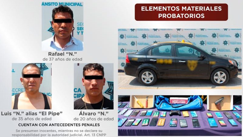 Como resultado de la implementación la Estrategia de Vectores de Proximidad para atender de manera efectiva los llamados de la población, en las últimas horas, el Ayuntamiento de Puebla que encabeza la Alcaldesa, Claudia Rivera, a través de la Secretaría de Seguridad Ciudadana (SSC) logró la detención de Rafael «N.», de 37 años de edad, Luis «N.», alias «El Pipe», de 35 años de edad y Álvaro «N.», de 20 años de edad, por su probable participación en hechos con apariencia de delito de robo a negocio.