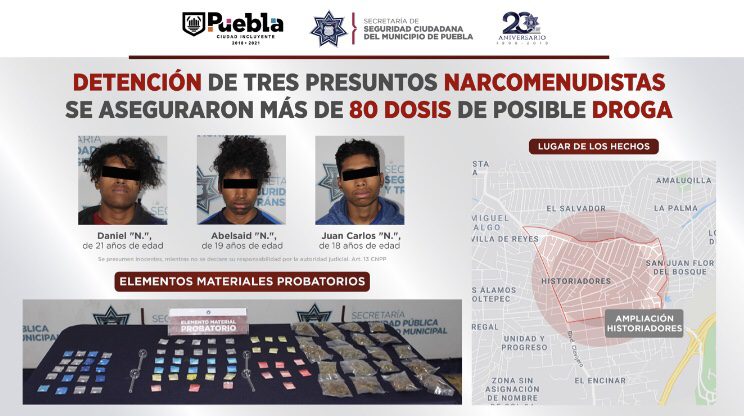 Derivado del reforzamiento de estrategias de vigilancia en diferentes puntos de la ciudad, la Secretaría de Seguridad Ciudadana (SSC) del Municipio de Puebla detuvo en la colonia Ampliación Historiadores a Daniel “N.”, Abelsaid “N.” y Juan “N.”, de 21, 19 y 18 años de edad, respectivamente, por su probable participación en hechos con apariencia de delitos contra la salud.