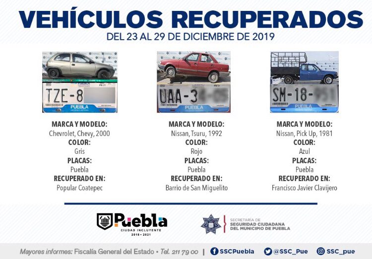Derivado del fortalecimiento de patrullajes preventivos en colonias, unidades habitacionales, barrios así como, en las 17 juntas auxiliares que conforman la ciudad, la Secretaría de Seguridad Ciudadana de Puebla reportó la recuperación de nueve vehículos con reporte de robo, en el periodo que comprende del 23 al 29 de diciembre del año en curso.