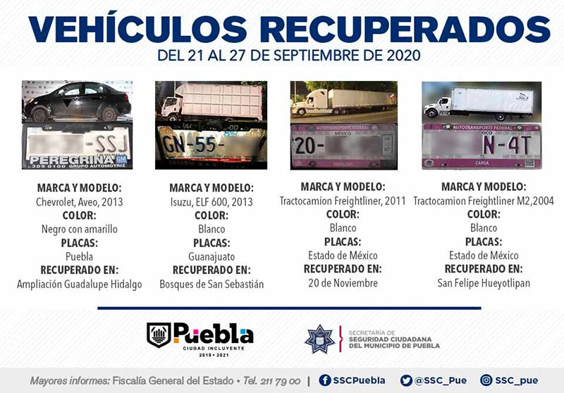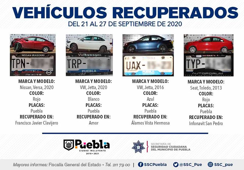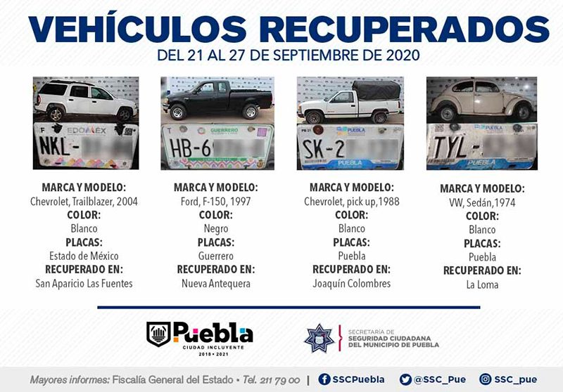 Como resultado del fortalecimiento de patrullajes de vigilancia en colonias, unidades habitacionales, barrios y juntas auxiliares, la Secretaría de Seguridad Ciudadana (SSC) del Municipio de Puebla reportó la recuperación de 12 vehículos con reporte de robo, en el periodo que comprende del 21 al 27 de septiembre del presente año.